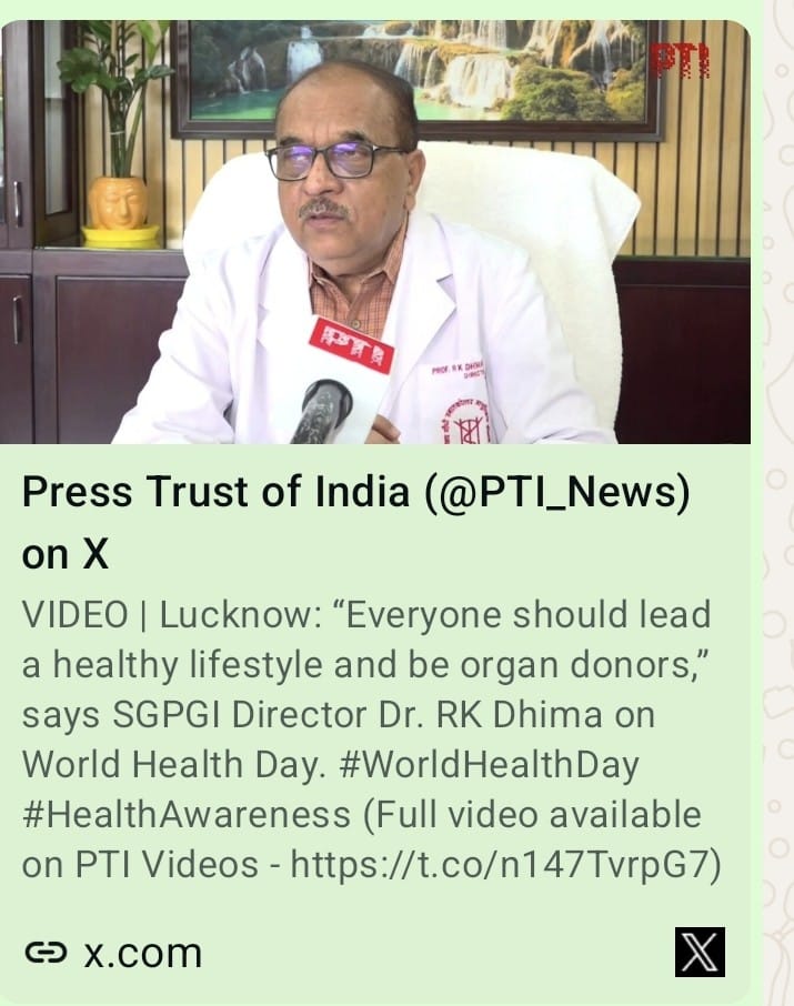 "Everyone Should lead a healthy lifestyle and be organ donors" Says SGPGIMS, Lucknow Director Dr. RK Dhiman on World Health Day. Press Trust of India(@PTI_News) on X