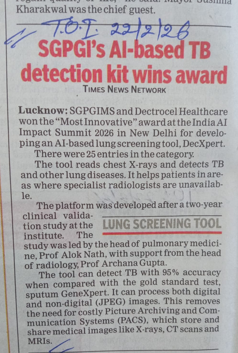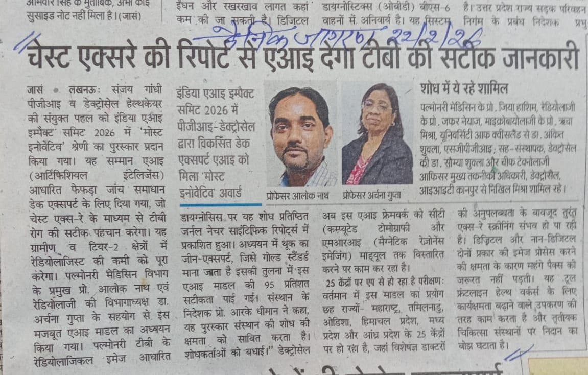The solution is the culmination of years of clinical validation within SGPGI. Led by Dr. Alok Nath (Head, Pulmonary Medicine) with the support of Dr. Archana Gupta (Head, Radiology), The clinical validation study of this robust AI Model aiming at radiological diagnosis of Pulmonary TB, was led by the Department of Pulmonary Medicine, SGPGIMS, and published in Nature Scientific Reports which demonstrated 95% accuracy for the diagnosis of Pulmonary TB when compared with the gold standard i.e. sputum GeneXpert.