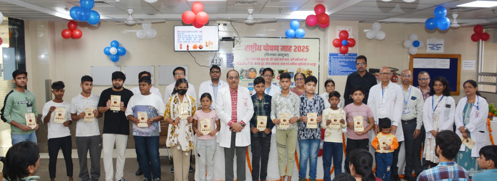 To mark the National Nutrition Month, an awareness programme was organized on 15th October, 2025 by the department of Pediatric Gastroenterology, SGPGI. The theme of this year awareness Programme was “Obesity in children”. The event was graced by Director, Prof. R K Dhiman, Chief Medical Superintendent, Medical Superintendent, Prof.& HOD Pediatric Surgery Dr. Basant Kumar, Prof. Praveer Rai, Prof Samir Mohindra and HOD Pediatric Gastroenterology Prof Ujjal Poddar, Prof. Anshu Srivastava, Prof L K Bharti, Dr. Ajay Aravind and Dr Nitu. On the eve of National Nutrition Month, Director Prof. R K Dhiman along other faculty members released a booklet on “Awareness and management of obesity/Fatty Liver in children” compiled by Department of Pediatric Gastroenterology with inputs from all the faculty members of the department. Later this booklet was distributed to all children free of cost. Director, SGPGI Prof Dhiman while addressing the gathering said that obesity is increasing very fast specially in urban children. Prof. Dhiman emphasized that adequate amount of sleep is very necessary to maintain the healthy life. Prof & HOD Dr Ujjal Poddar emphasized on the importance of balance diet in children. Chief Medical Superintendent Dr Devendra Gupta spoke on prevention of obesity in children.