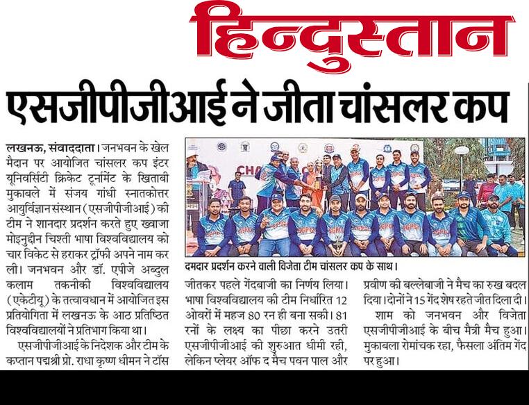 In the final match of Chancellor Cup Inter University Cricket Tournament played on 8th March, the team of Sanjay Gandhi Postgraduate Institute of Medical Sciences, Lucknow won the title by defeating the team of Khwaja Moinuddin Chishti Language University by 4 wickets.