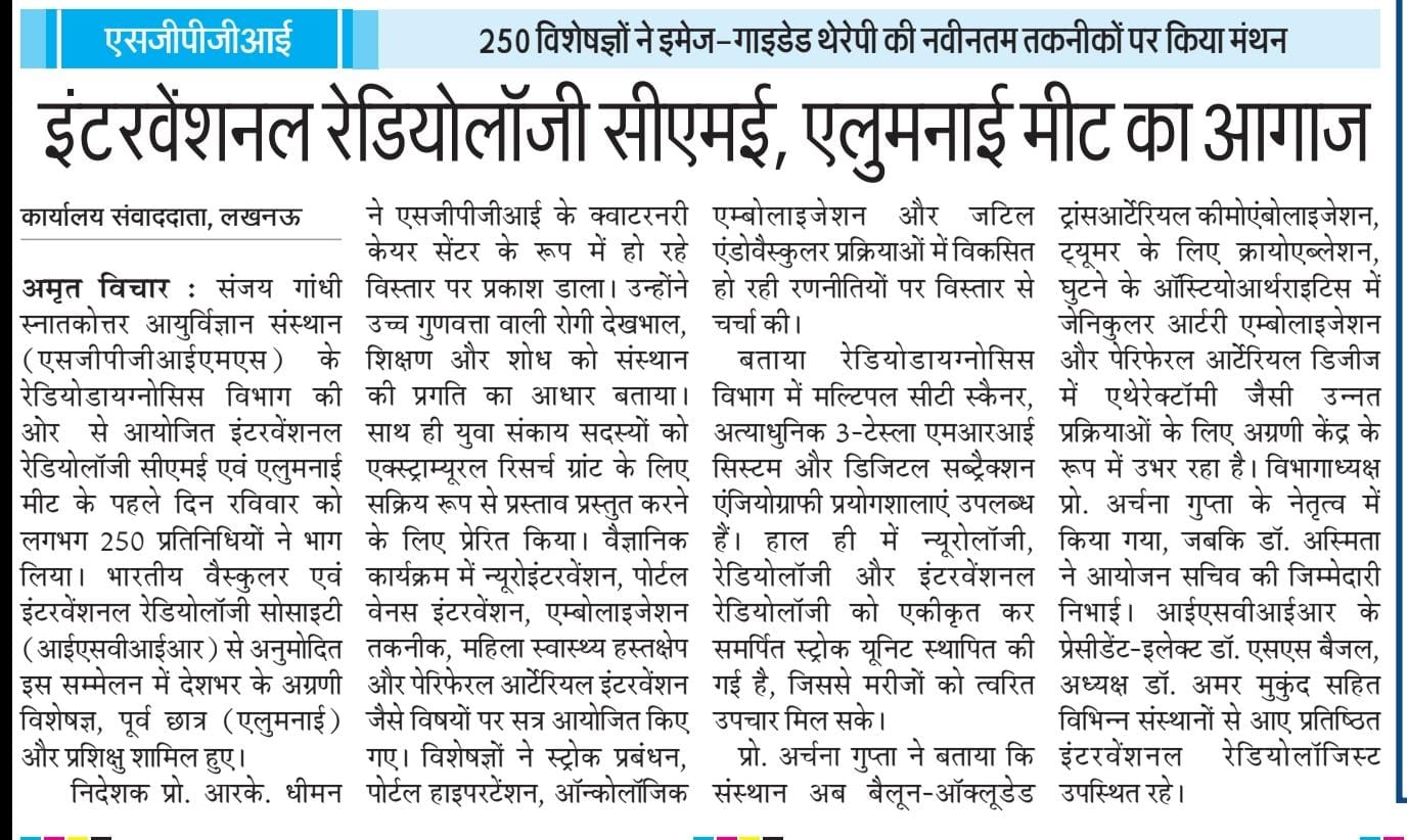 Around 200–250 delegates participated in the first day of the Interventional Radiology CME and Alumni Meet organized by the Department of Radiodiagnosis at the Sanjay Gandhi Postgraduate Institute of Medical Sciences on 28th February. The conference, endorsed by the Indian Society of Vascular and Interventional Radiology (ISVIR), brought together leading experts, alumni, and trainees from across the country to discuss recent advances in image-guided therapies.