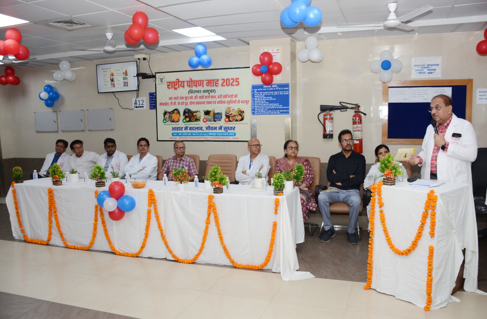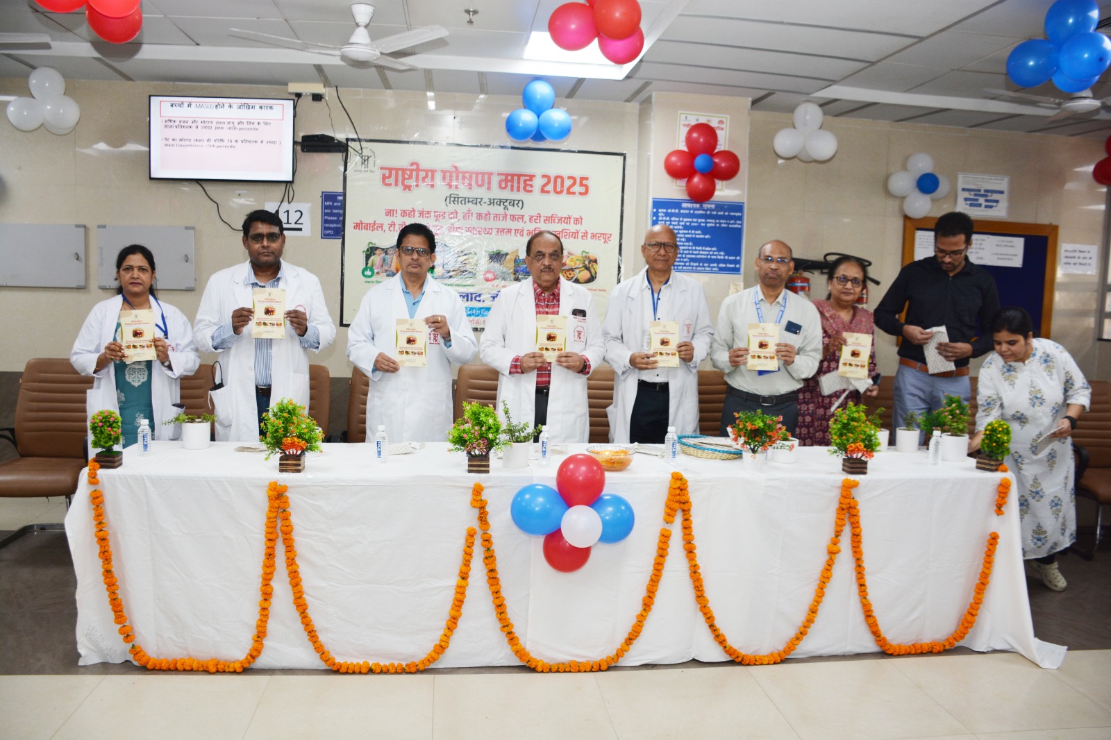 To mark the National Nutrition Month, an awareness programme was organized on 15th October, 2025 by the department of Pediatric Gastroenterology, SGPGI. The theme of this year awareness Programme was “Obesity in children”. The event was graced by Director, Prof. R K Dhiman, Chief Medical Superintendent, Medical Superintendent, Prof.& HOD Pediatric Surgery Dr. Basant Kumar, Prof. Praveer Rai, Prof Samir Mohindra and HOD Pediatric Gastroenterology Prof Ujjal Poddar, Prof. Anshu Srivastava, Prof L K Bharti, Dr. Ajay Aravind and Dr Nitu. On the eve of National Nutrition Month, Director Prof. R K Dhiman along other faculty members released a booklet on “Awareness and management of obesity/Fatty Liver in children” compiled by Department of Pediatric Gastroenterology with inputs from all the faculty members of the department. Later this booklet was distributed to all children free of cost. Director, SGPGI Prof Dhiman while addressing the gathering said that obesity is increasing very fast specially in urban children. Prof. Dhiman emphasized that adequate amount of sleep is very necessary to maintain the healthy life. Prof & HOD Dr Ujjal Poddar emphasized on the importance of balance diet in children. Chief Medical Superintendent Dr Devendra Gupta spoke on prevention of obesity in children.